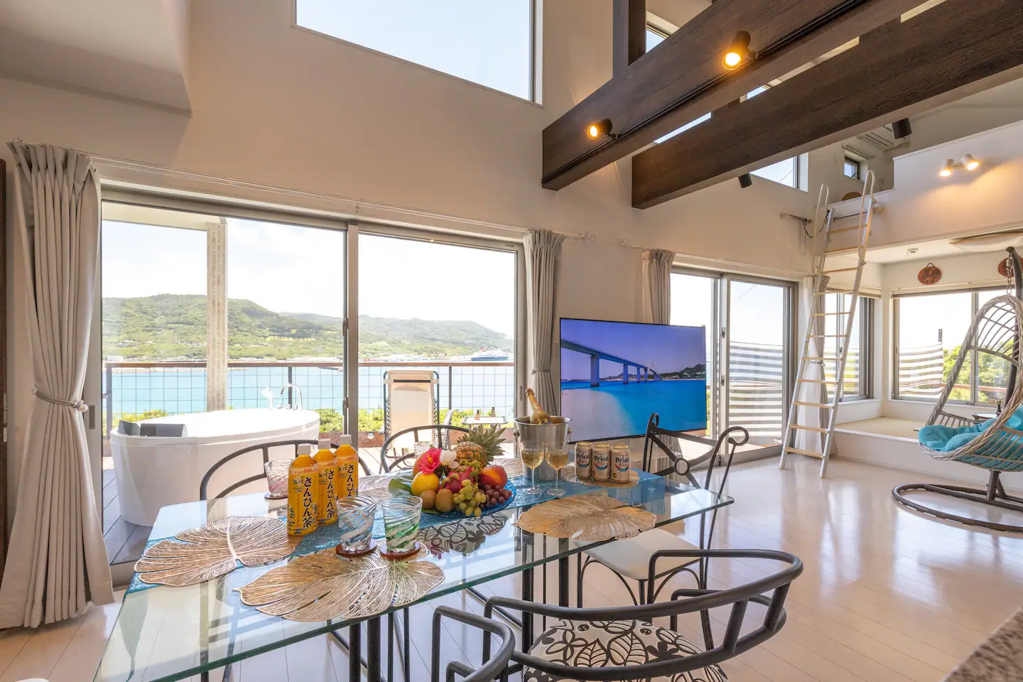 吹き抜けによる採光、景色を最大限に活かした窓の位置取り、家具やインテリア等の細部までこだわって建築し民泊をスタートいたしました。
