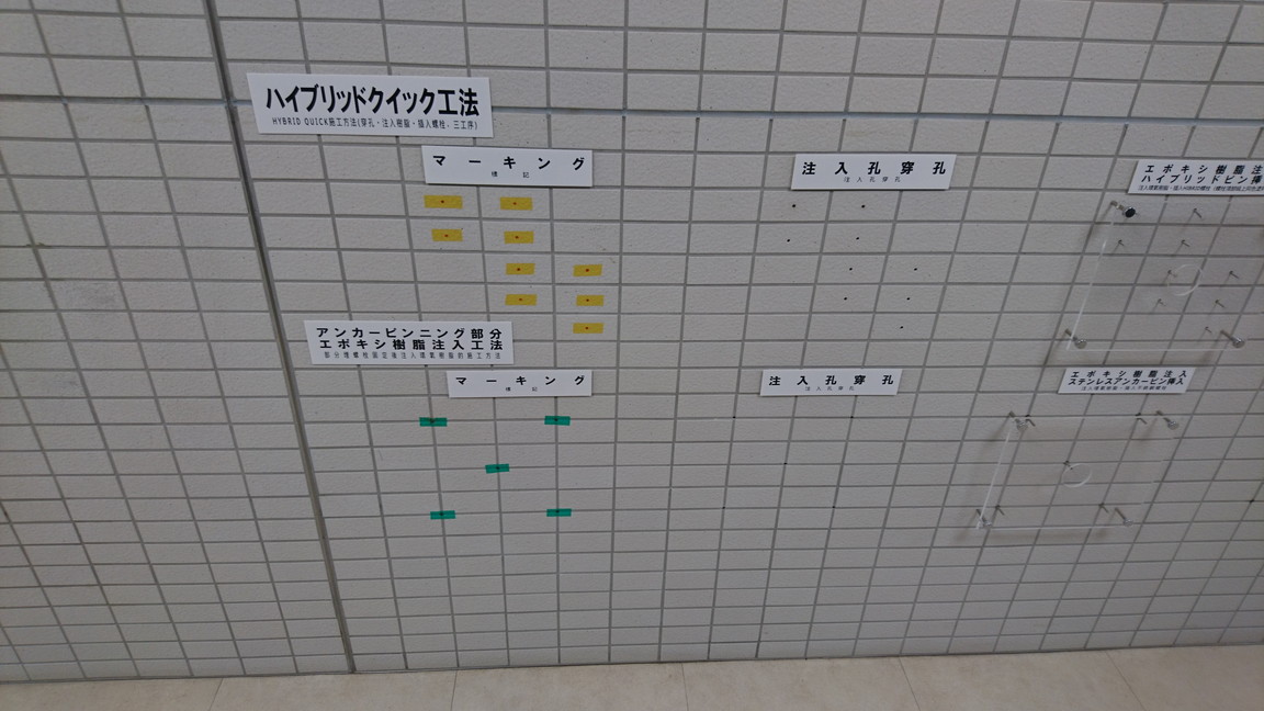 タイルの浮いている隙間にエポキシ樹脂(接着剤みたいなものの液)を注入し、アンカーピン(径が4mmのギザギザなピンの事)で建物に固定する工法です。