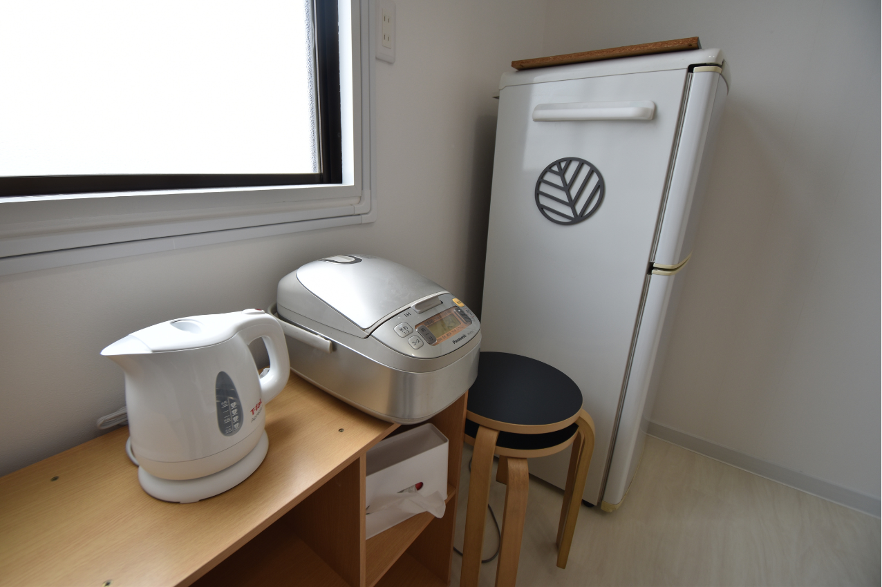 ◆キッチンに包丁や鍋、フライパン等の簡単な調理器具、食器類をご用意。また、2ドア冷蔵庫、電気ケトル、電子レンジといった家電も設置。