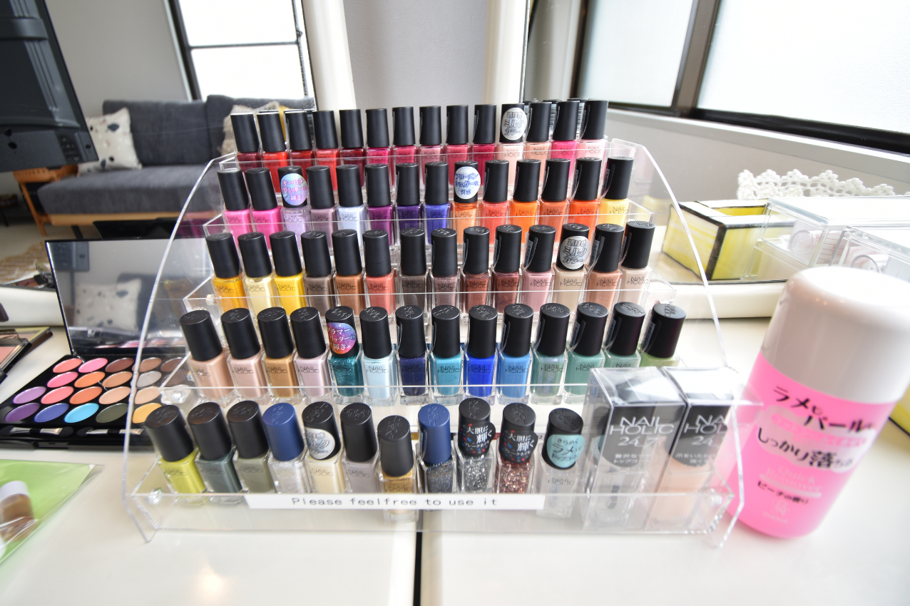 こちら、まるでデパートのコスメ売り場のような素敵な空間!こちらのメイク道具すべてご利用いただけます!ネイルもお店並みの充実ぶりです!